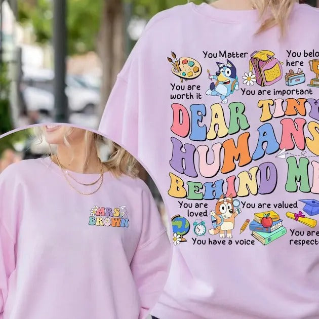 Bluey Happy Teacher Custom Name Tee, Bluey Teachers Half School Year Gift, Bluey Heeler Teacher Dear Tiny Humans Behind Me Tshirt, Bluey Custom Shirt, Bluey Friends Shirt