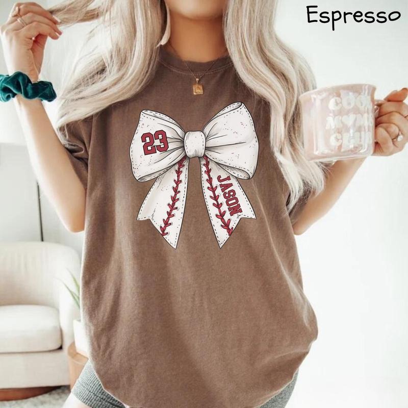 Comfort Colors Custom Baseball Bow T-Shirt, Baseball Mom T-Shirt With Kids Name & Jersey Number, Baseball Wife T-Shirt, Cute Baseball Mama Shirt, Baseball Season