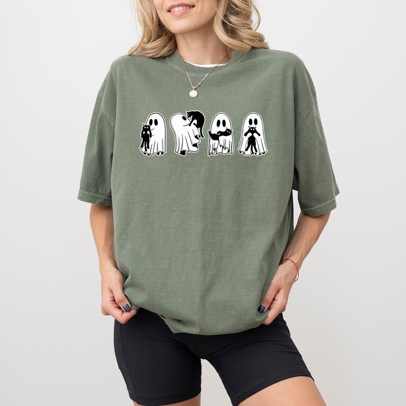 Cute Ghost with Black Cat Shirt Comfort Colors, Funny Halloween Boo Cats Tees, Spooky Season T-shirt, Cute Ghost Tshirt, Ghost Hugging Black Cat Shirt For Women, Spooky Season Outfits, Casual Fall Autumn Womenswear, Cotton Fabric Relaxed Fit Chic Style