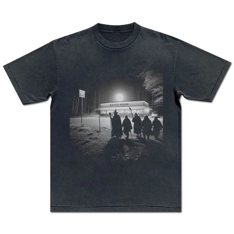 Gray Wizard and Fellowship at Waffle Restaurant Middle of Earth Tee Tolkien Book Christmas Birthday Gift Vintage 90s Tee AI Trail Cam Shirt