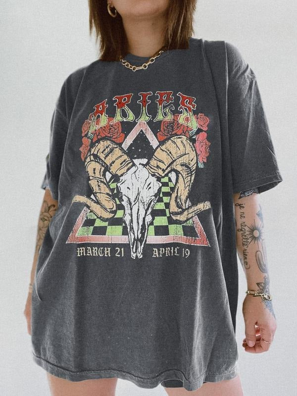 Women's Goat & Figure Print Round Neck Tee, Vintage Trendy Casual Short Sleeve T-shirt for Daily Wear, Ladies Summer Outfit, Top